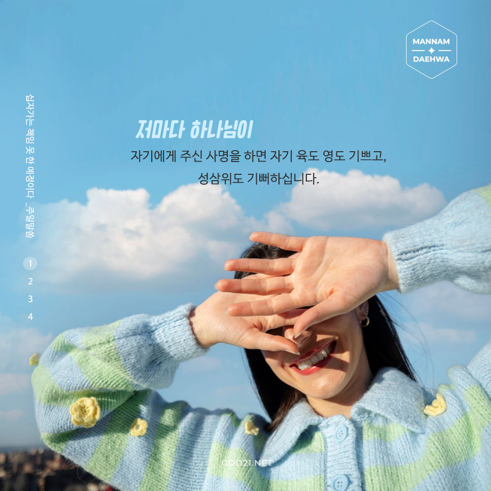 저마다 하나님이 자기에게 주신 사명을 하면 자기 육도 영도 기쁘고, 성삼위도 기뻐하십니다.