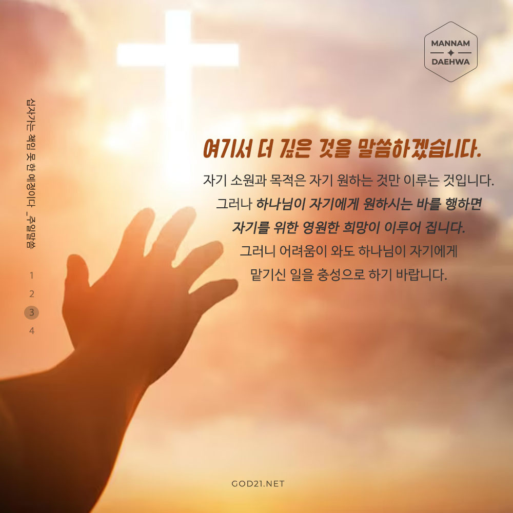 그러나 하나님이 자기에게 원하시는 바를 행하면 자기를 위한 영원한 희망이 이루어 집니다.